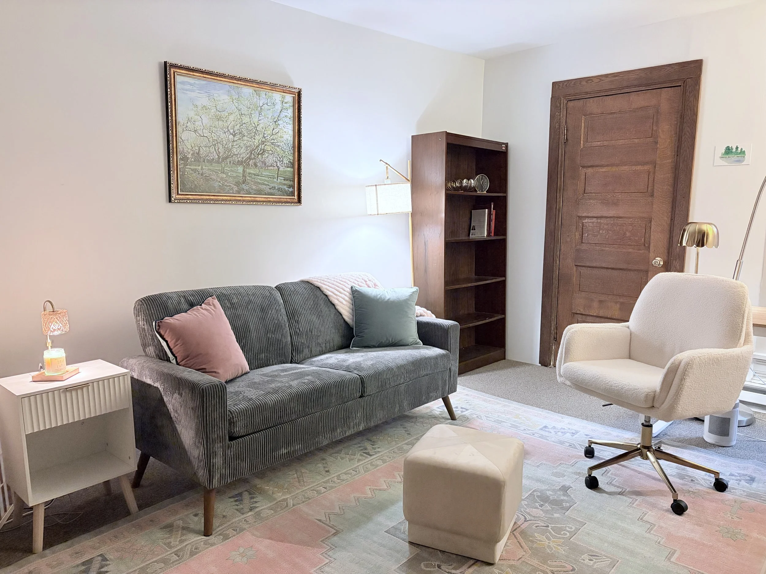 My practice is considered out-of-network with insurance providers. Clients can request to receive Superbills from my practice in order to submit for reimbursement from their insurance provider. Telehealth sessions are held via video through SimplePractice, a HIPAA-compliant practice management platform. In-person sessions are available in my Trumansburg, NY office pictured below.